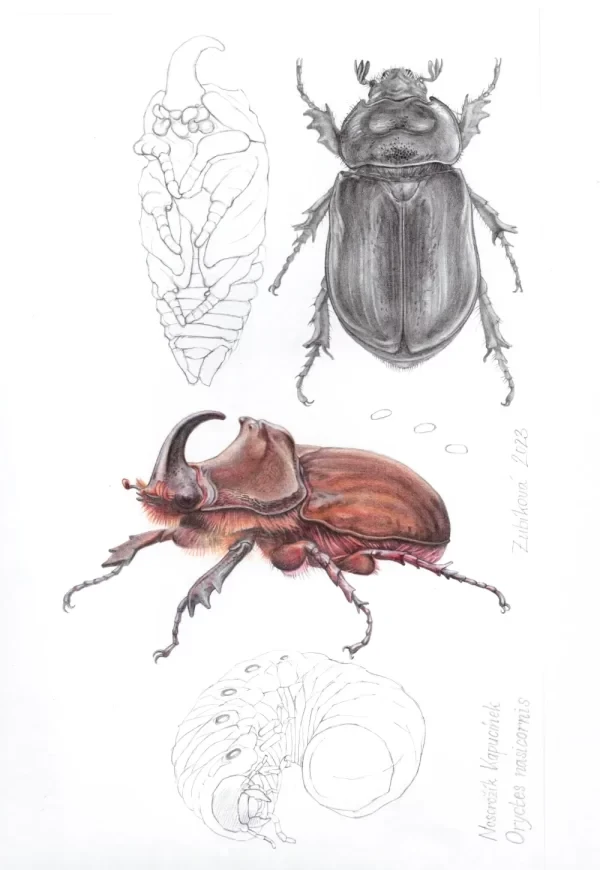 Krovky nosorožíka jsou lesklé, s jemným tečkováním a s jemným zbarvením do červenohnědé. U nosorožců lze pozorovat výrazný pohlavní dimor smus, tedy výrazné rozdíly mezi samečkem a samičkou. Samci mají dlouhý roh zahnutý dozadu a lehce zdvižený štít s dvěmi tupými výstupky. Samice mají náznak rohu pouze v hrbolu a ve štítu pozorujeme oválný protlak. Larvy nosorožíka se vyvíjejí v tlejících přírodních odpadech jako je kompost, pařezy listnatých stromů či pilinách. Vývoj larvy nosorožíka trvá podobně jako u roháče 2 – 3 roky. Ponravy nosorožíka je možné zaměnit s larvami zlatohlávků a chroustů, narozdíl od nich ale ponravy nosorožíka dorůstají až do délky 12 cm. Zakuklí se ve vytvořeném dutém útvaru a po několika týdnech se líhne dospělec, který přezimuje do dalšího roku.